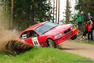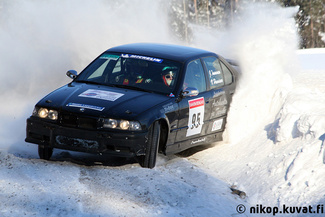 Janne Immosen ja Ville Huovisen ensimmäinen ralli. Kuvan jälkeen BMW pyörähti katon kautta ympäri.